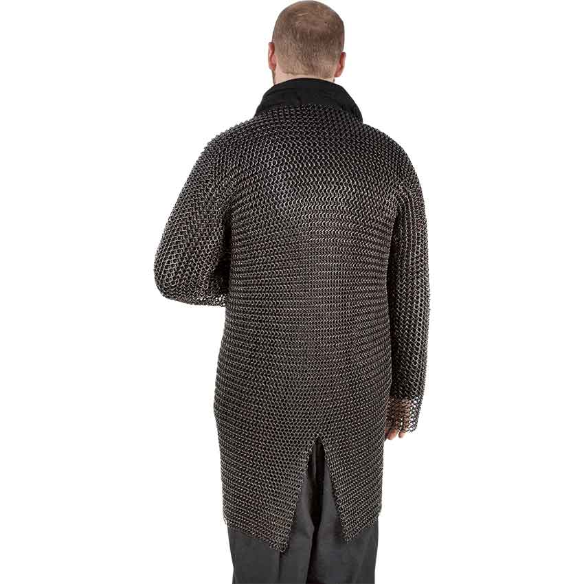 Whether a Viking or Crusader, a medieval soldier should not be without chainmail. The Blackened Butted Chainmail Hauberk adds an authentic appearance. It is available in a range of sizes. Made from butted 16 gauge steel rings, this long-sleeved, chainmail hauberk features a blackened finish to increase its resistance to rust. The 10 millimeter diameter rings form a classic 4-in-1 pattern. A 4-in-1 pattern consists of four chainmail rings woven through another ring. A back and front slit on the hauberk allow for greater mobility. Cut wide, the long sleeves provide great coverage. Wear this knightly armoured shirt to a historical reenactment or LARP event.