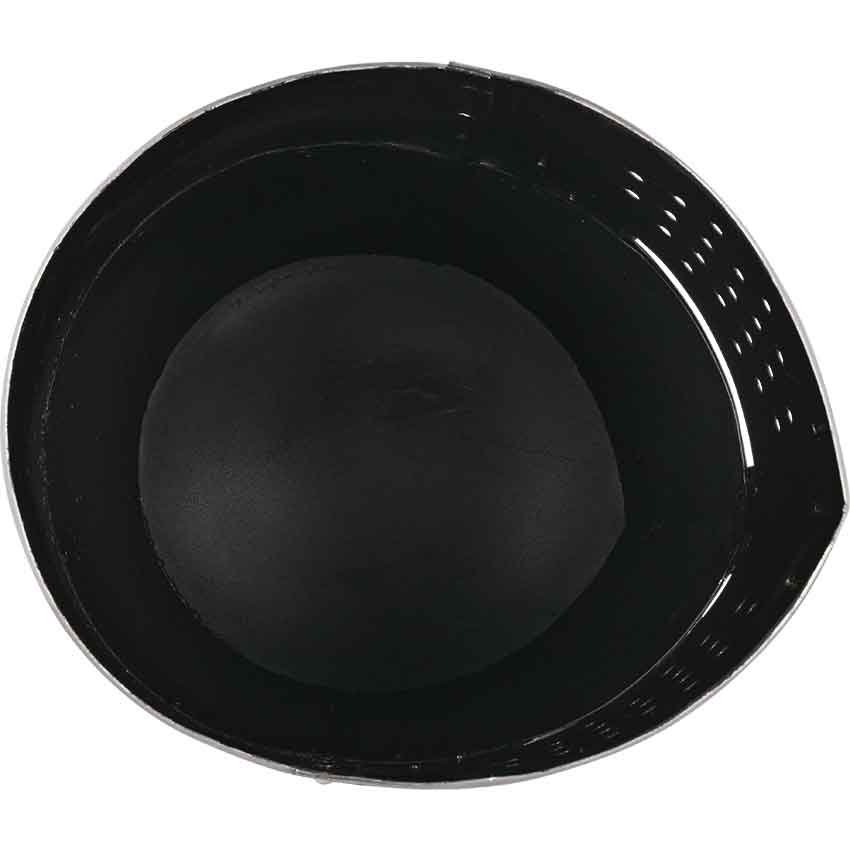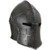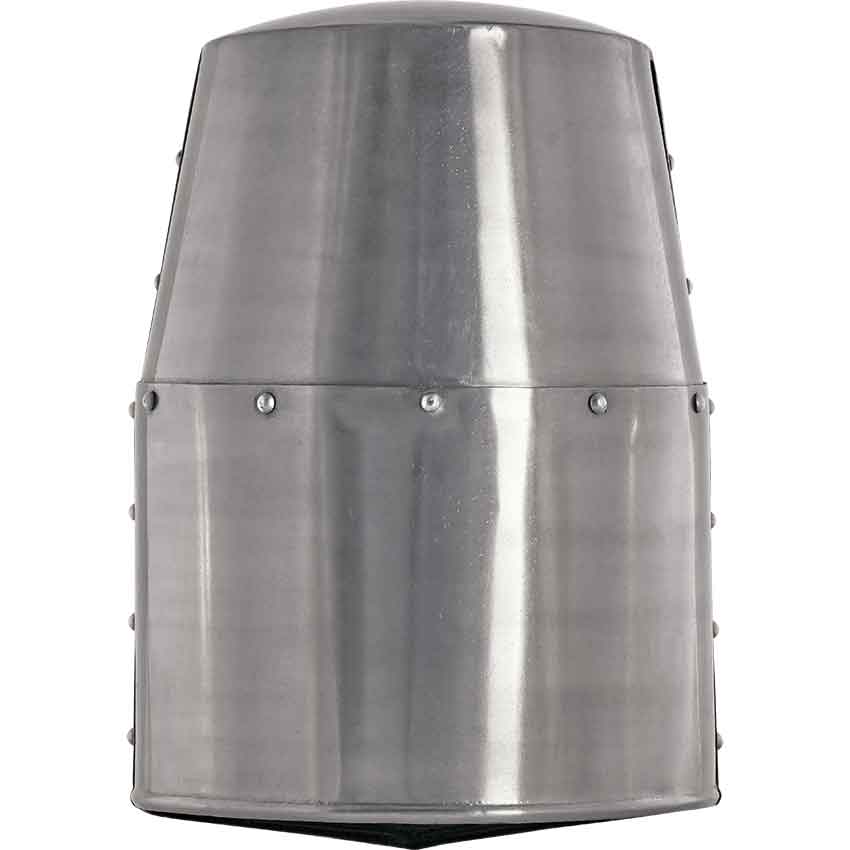 The Crusader Great Helm was developed early in the 13th century. The Great Helm became the mainstay of the medieval fighting man and lasted for about 300 years. Sometimes worn over a smaller helmet and mail, this beautiful helmet with its menacing, narrow eye slits was a strong, tough steel helmet fully capable of absorbing the shock of combat. This particular version has brass reinforcing bands, and is produced by hand with the same techniques they used over 600-800 years ago. The Crusader Great Helm is handmade from 18 gauge high carbon steel and fully wearable. No padding is included.