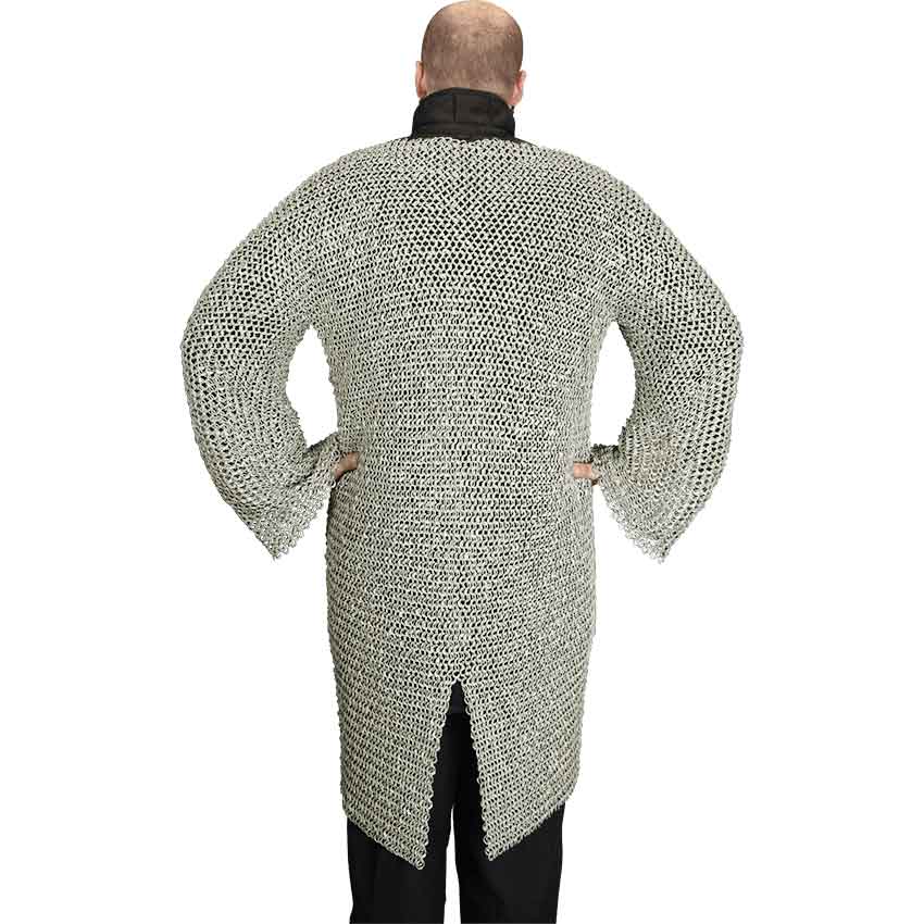 Every warrior needs good defense in battle. Feel as mighty as a knight or Viking raider in the Flat Ring Wedge Riveted Chainmail Hauberk. With its long sleeves and tunic length, this chainmail shirt provides comprehensive protection. The front and back hems of the medieval hauberk are slit for ease of movement. Each of its 18 gauge steel rings has a diameter of 8 millimeters, and they are flattened for a tighter weave as well as riveted for durability. Woven in a traditional 4-in-1 pattern, this steel chainmail hauberk is perfect for light historical reenactment, LARP, and costume use. A 4-in-1 pattern consists of four chainmail rings woven through another ring. Available in a variety of sizes, this chainmail hauberk is perfect for creating the look of a Crusader, medieval knight, Viking warrior, or other character from history or fantasy.