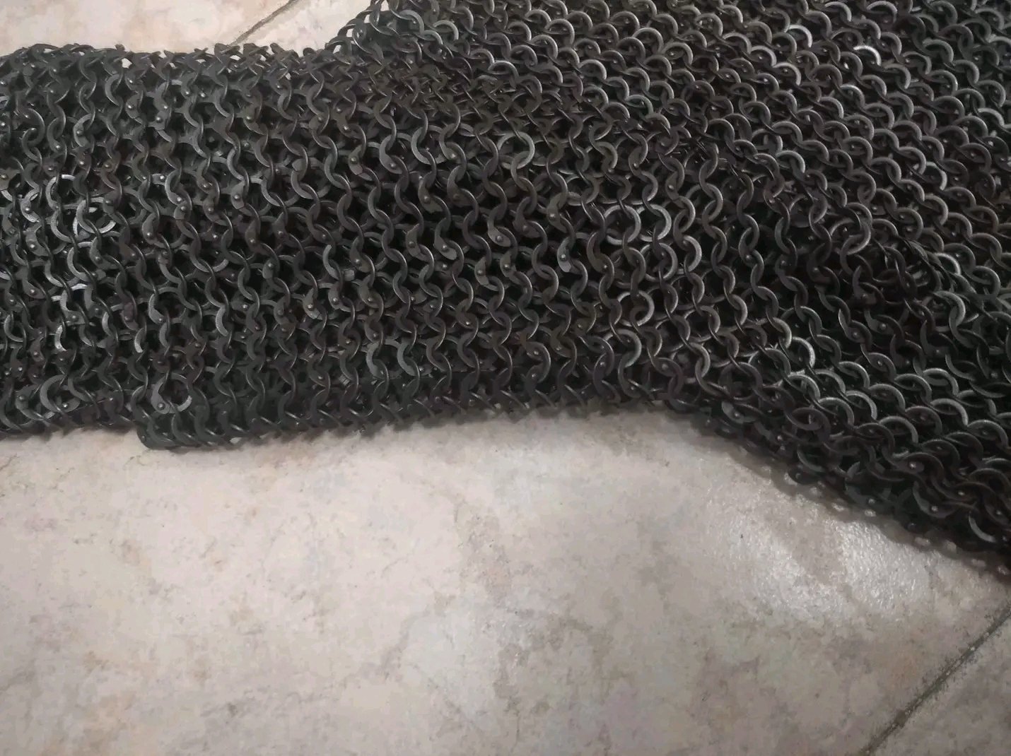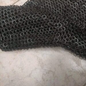 It is made with blackened flat rings that are closed with round rivets. This maille hauberk has barely been used and is on pristine condition.