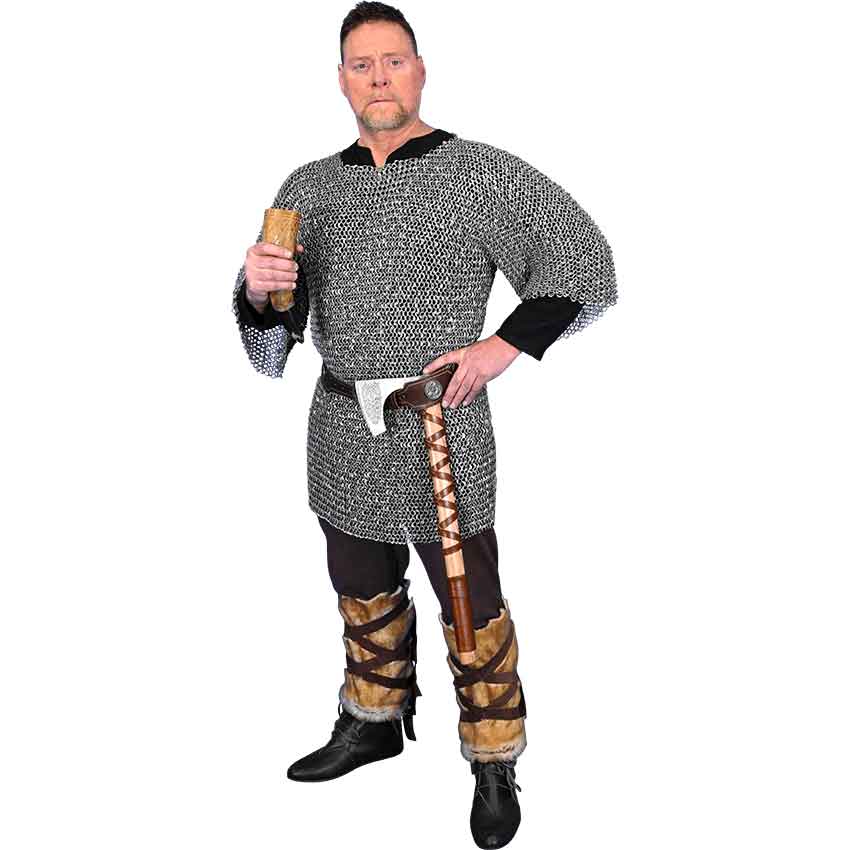 It is important to have a thorough defense when armouring up for battle. Whether worn as your main protection or paired with other armour pieces, the Riveted Aluminum Chainmail Haubergeon has you covered for costuming, LARP, and more. This medieval hauberk is crafted from 16 gauge aluminum rings that have been woven together in a traditional 4-in-1 pattern. A 4-in-1 pattern consists of four chainmail rings woven through another ring. Each ring of the hauberk is 10 millimeters in diameter, ensuring a tight weave. The three-quarter sleeves of this chainmail shirt hit below the elbows and above the wrist on most wearers. Aluminum is rust resistant, making this chainmail shirt an ideal option for costume use. The Riveted Aluminum Chainmail Haubergeon comes in a variety of sizes, making it a fantastic piece of medieval armour that can be worn on its own or with a plate armour ensemble.