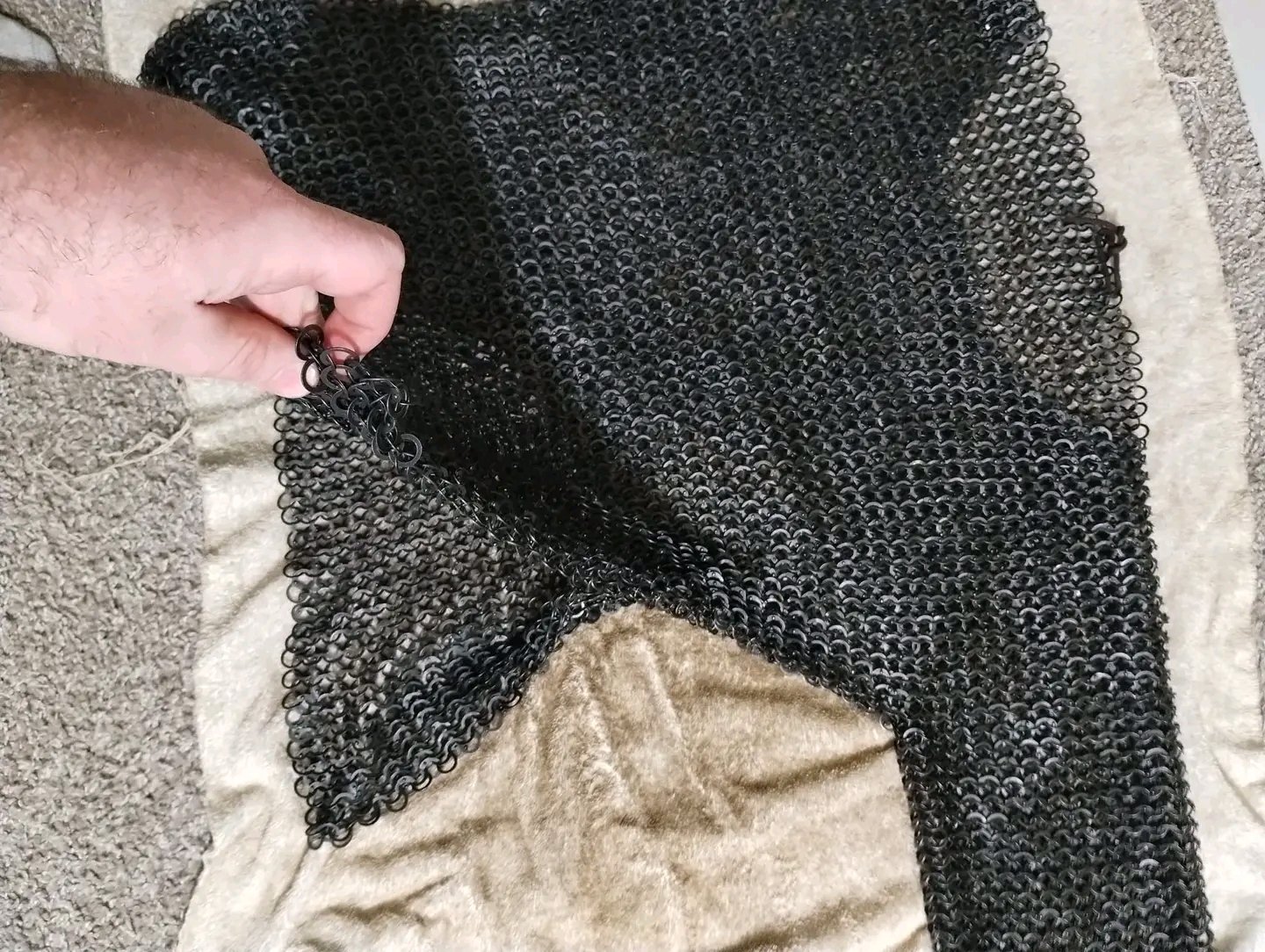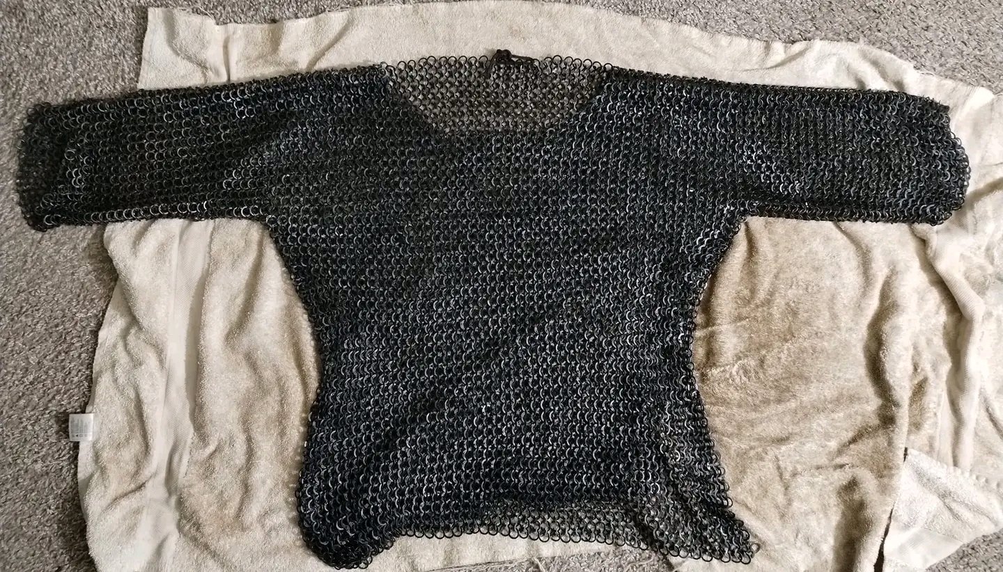 Riveted steel chainmail shirt. 3/4 sleeves for up to a 42″ chest.
