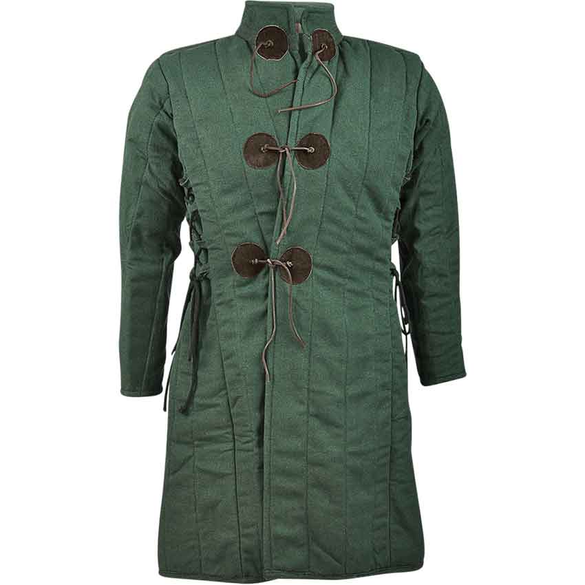 While the Shapur Gambeson goes well with a variety of historical looks, its design bares an Eastern Asian influence. An outer layer of cotton canvas combined with polyester padding offers extra protection on the LARP battlefield. The oriental cut of the gambeson is emphasized by its mandarin collar and overlapping closure. Three sets of leather strings attached to round felt accents close the front, while cotton lacing adjusts the fit at the waist. The canvas layer enhances the durability, while the felt gives it a slimmer, more comfortable fit when worn under plate armour.