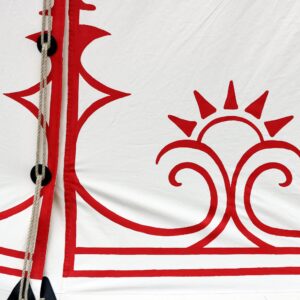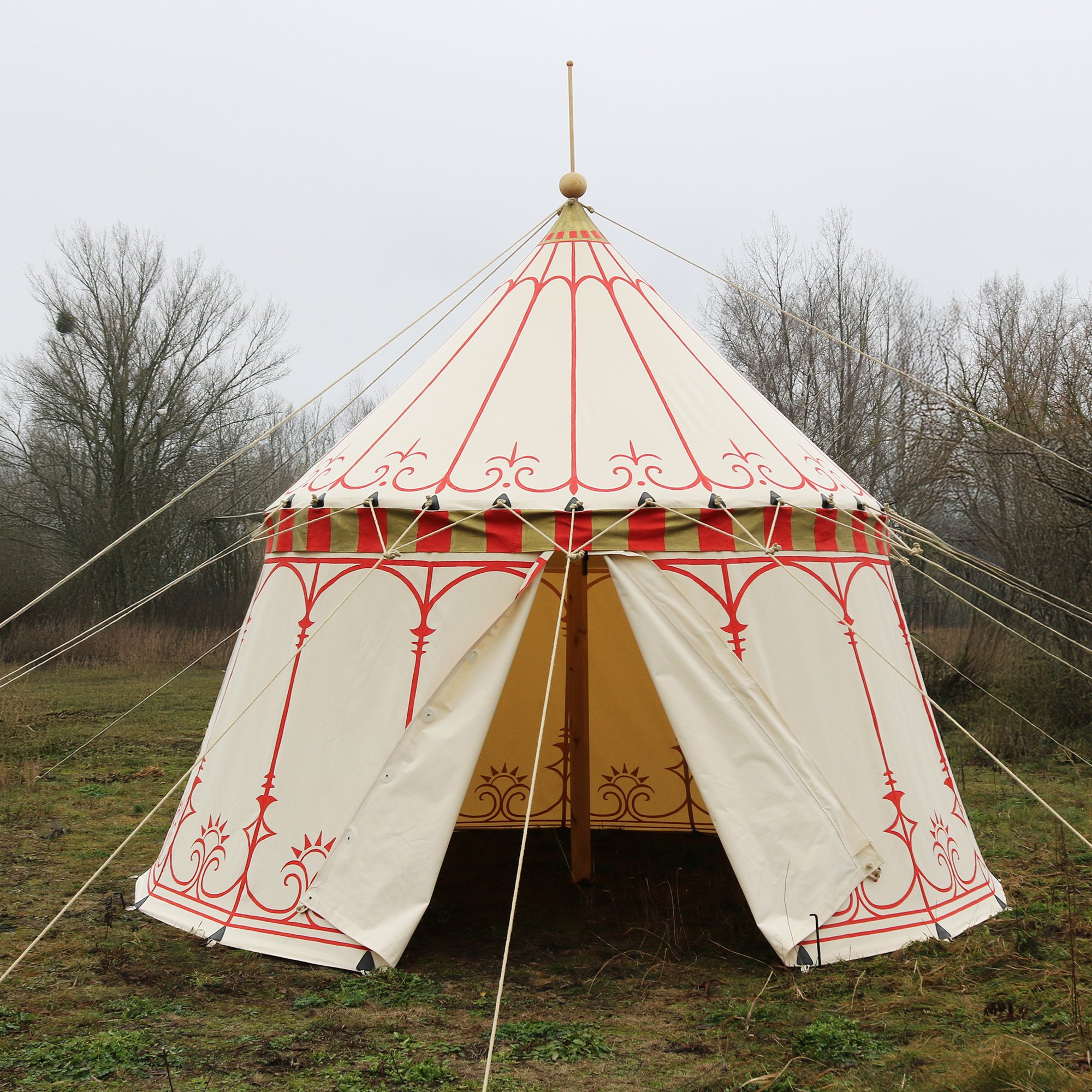 Well, if we say so ourselves – this one turned out amazing! 😍 A single-pole pavilion with a hand-painted pattern. The rich red color pairs beautifully with gold, making the whole piece stand out on any medieval campsite. A tent straight out of a dream – we absolutely love working on orders like this! ⛺✨